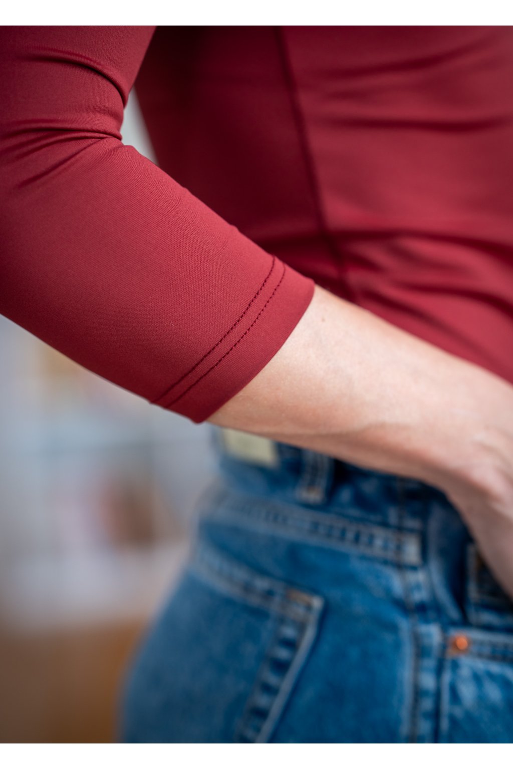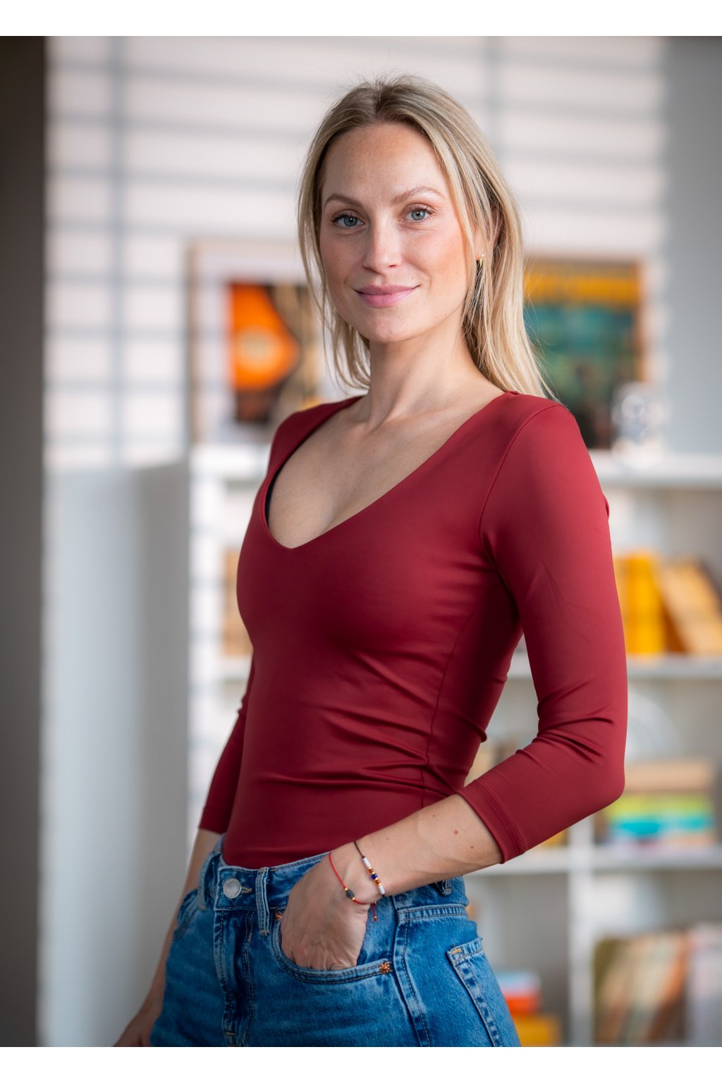 Tričko s hlubokým výstřihem do V, 3/4 rukáv - vínová - merlot