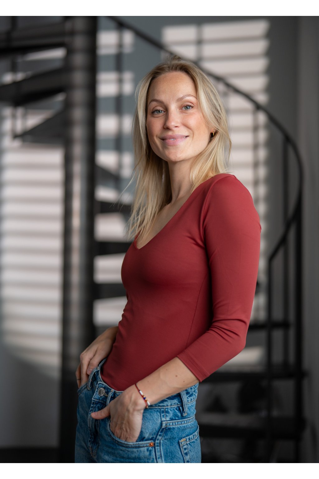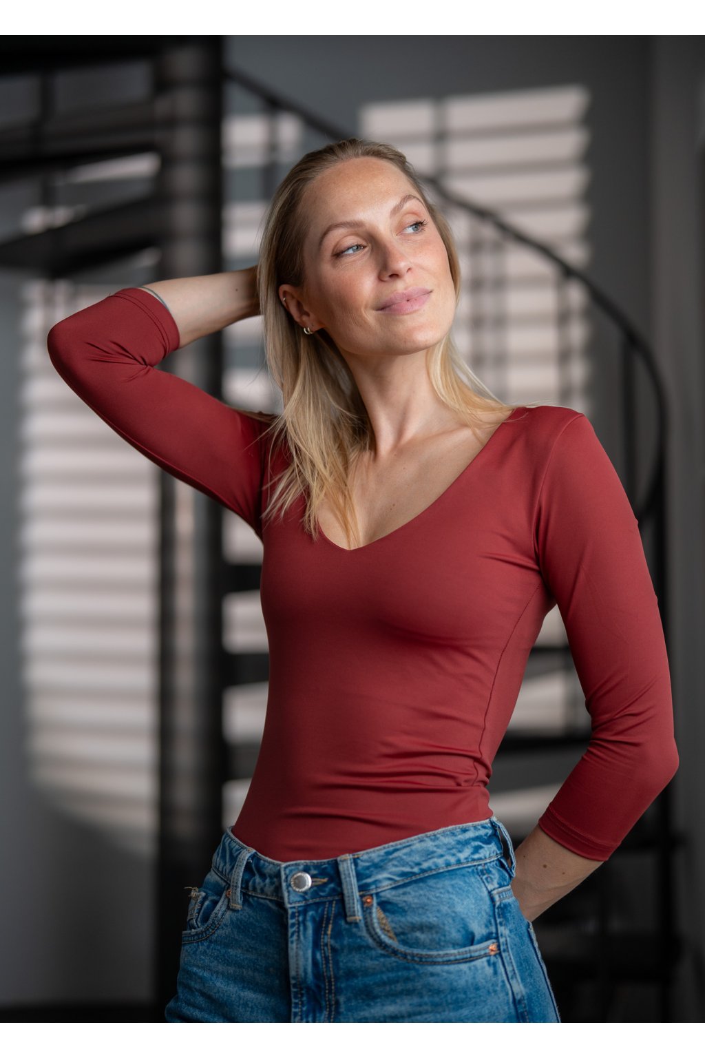 Basic triko s 3/4 rukávem a hlubokým výstřihem do V je ušité z pružného a vysoce kvalitního materiálu. V přední části v okolí hrudníku je vsadka a látka je zdvojená. To zajistí neprůsvitnost, zpevnění poprsí a slušivý dekolt. Basic kousek, který je elegantní a sexy zároveň a rozhodně nesmí chybět v žádném šatníku. Vkusně doplní jakýkoliv outfit. Kompletně vyrobeno v České republice.